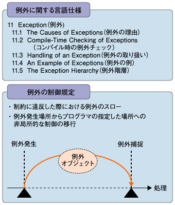 例外とは何か 皆さんは例外というものをどのようにとらえているでしょうか。初心者であれば極力お目に掛かりたくないし、避けて通りたいものかもしれません。それは「例外=エラー=悪」という単純な思い込みがあるからではないでしょうか。 しかしJavaの世界において例外を無視することはできません。そこで今回は言語仕様を元に例外というものがどのように定義されているかをみていくことにしましょう。例外の言語仕様は、「11 Exceptions(例外)」にまとめられています。 ![]() その冒頭では、例外とは何かを説明しています。 When a program violates the semantic constraints of the Java programming language, the Java virtual machine signals this error to the program as an exception. (訳:プログラムが、プログラミング言語Javaにおけるセマンティクス上の制約に違反した場合、Java仮想マシンはこのエラーをプログラムに例外として通知する)。 セマンティクスとは何とも難しい表現ですが、これはプログラマがプログラムに込める意図と考えるとわかりやすいでしょう。その意図に反する場合、Javaではエラーをエラーのまま伝達するのではなく、エラーとは別のもの(ここでは「例外オブジェクト」と呼ぶ)にラッピングした形で伝達します。エラーがエラーそのものであるのに対して、例外はエラーの種類ごとに整理されたエラー情報を格納した器といえます。例外はエラーの別名ではなく、Javaの1つの機能に他なりません。 若干回りくどい説明をしましたが、言語仕様を読むとその背景がみえてきます。 Some programming languages and their implementations react to such errors by peremptorily terminating the program; other programming languages allow an implementation to react in an arbitrary or unpredictable way. Neither of these approaches is compatible with the design goals of the Java platform: to provide portability and robustness. (訳:ある種のプログラミング言語やその実装では、プログラムの強制終了によってこういったエラーに対応していたり、またその他のプログラミング言語では、不定の結果や予測できない結果となることを実装に対して許しているものもある。こういったアプローチは、どちらもポータビリティと堅牢さを提供するというJavaプラットフォームの設計目標とは合致していない)。 つまり、他のプログラミング言語の反省点がJava言語の仕様策定に影響を与えているのです。言語仕様にはこのような背景も記載されているので興味深いですね。 さてJavaでは呼び出し元に異常を知らせるときは例外をスロー(throw)しますが、このことについてもなぜスローする必要があるのかを言語仕様では語っています。 Explicit use of throw statements provides an alternative to the old-fashioned style of handling error conditions by returning funny values, such as the integer value -1 where a negative value would not normally be expected. Experience shows that too often such funny values are ignored or not checked for by callers, leading to programs that are not robust, exhibit undesirable behavior, or both. (訳:明示的なthrow文を使用することによって、従来では通常の場合には負の値が返されないはずの場所から整数値-1のような特異な値を返すことによって行われていた、旧式のエラー・ハンドリング手法に代わる手段が提供される。従来手法による特異な値が、無視されたり、呼び出し側でチェックされないことに起因するプログラムの堅牢性の低下、予期せぬ振る舞い、またその双方があまりにも数多く引き起こされることは経験が示す通りである)。 ここでも旧来の反省点を基に例外というものが考えられたことがおわかりでしょう。 例外の制御方法は、言語仕様により規定されています(図参照)。図に登場する例外オブジェクトとはnull型やプリミティブ型で、これらをスローすることはできません。つまり例外というオブジェクトを使用してエラー処理をコントロールしているのです。まさに例外こそオブジェクト指向的といえるでしょう。 次に、例外クラスについて理解していきましょう。 |
