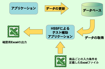 HSSFの使用例 このアプリケーションは入力された注文情報をデータベースに格納するというシンプルなものですが、注文された商品によって入力項目の必須条件、入力不可などの条件が異なっていました。また、データベースに保存する際には正規化された形式になるため確認作業に多くの時間がとられていました。 そこで、入力条件を定義したExcelファイルとデータベースから取得したデータを比較し、異常と思われる項目には色を付けるなどの人間が確認しやすい形に変換して、Excelファイルを出力するテスト補助アプリケーションを作成しました。このテスト補助アプリケーションによりテストの効率・精度が格段に良くなりました。 ![]() |