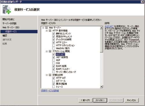 1)サーバー マネージャーの「役割」の設定画面内の「Webサーバー(IIS)」から「役割サービスの追加」を選び、ASP.NETを有効化する(ASP.NETの有効化と同時に.NET拡張、ISAPI拡張、ASAPIフィルターも有効化されます)。