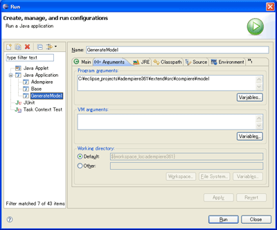 72行目からmainクラスがあり、Eclipseの実行ダイアログから引数を指定して実行することができます。GenerateModel.javaのエディタをアクティブにした状態で、Eclipseのメニューバーにある「Run」から実行設定のダイアログウィンドウを開いてください。Runダイアログの左上にある新規作成アイコンをクリックするとGenerateModelの実行設定が作成されます。