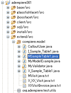 処理が完了した後、パッケージエクスプローラーの「extend/src > compiere.model」 を選択して再読み込み(右クリック⇒RefreshまたはF5キー)すると、生成されたI_Sample_Table1.javaとX_Sample_Table1.javaが表示されます。