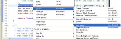 コードを追加すると、"MSampleTable1"の部分でエラーになり、赤い波線が表示されるので、ダブルクリックで"MSampleTable1"を選択 ⇒ 右クリック ⇒ Source ⇒ Add Import でimport文を追加してください。