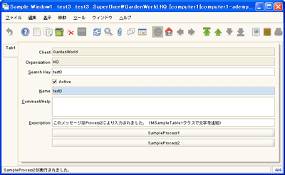 Adempiereのメニューから「Sample Window1」を表示させて、「SampleProcess2」ボタンを押してください。「Description」の項目に自動で文字が設定されます。