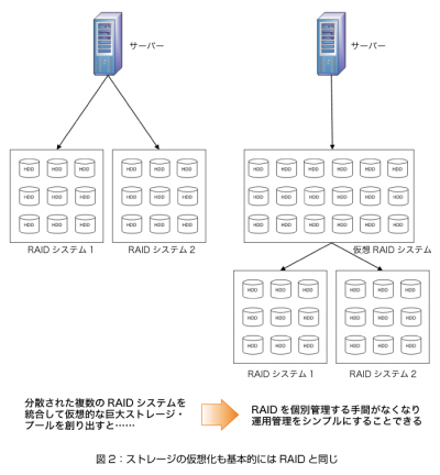 RAIDによって、単体のHDDドライブの制約や限界を超える柔軟な運用が可能になるが、これだけなら改めて「ストレージ仮想化」というほどのことではなく、それこそ20年ほどの歴史のある古い技術ということになる。