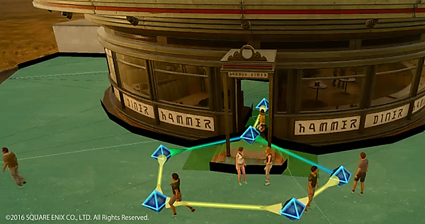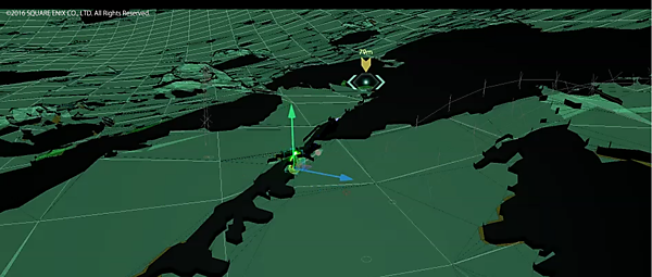 これが何もない野原で起こる戦闘であれば特に問題なく決定できます。しかし、実際には起伏や岩や木々やダンジョンの中で戦闘が起こります。従来は「そのマップがどんな形状か」をゲームデザイナーが把握して、事前にキャラクターごとのに立ち位置を指定したデータを作成していました。しかし、その手法が可能だった理由は比較的マップが狭かったこと、一方向の回廊などでキャラクターの立ち位置が限定されていたことです。現在のゲームで主流のオープンマップ、つまり移動の自由度が高い「FINAL FANTASY XV」のようなゲームでは役立ちません。そこで、ゲーム内でキャラクターが動的に戦術的位置を見つけられる「戦術位置検索システム」を導入しています。