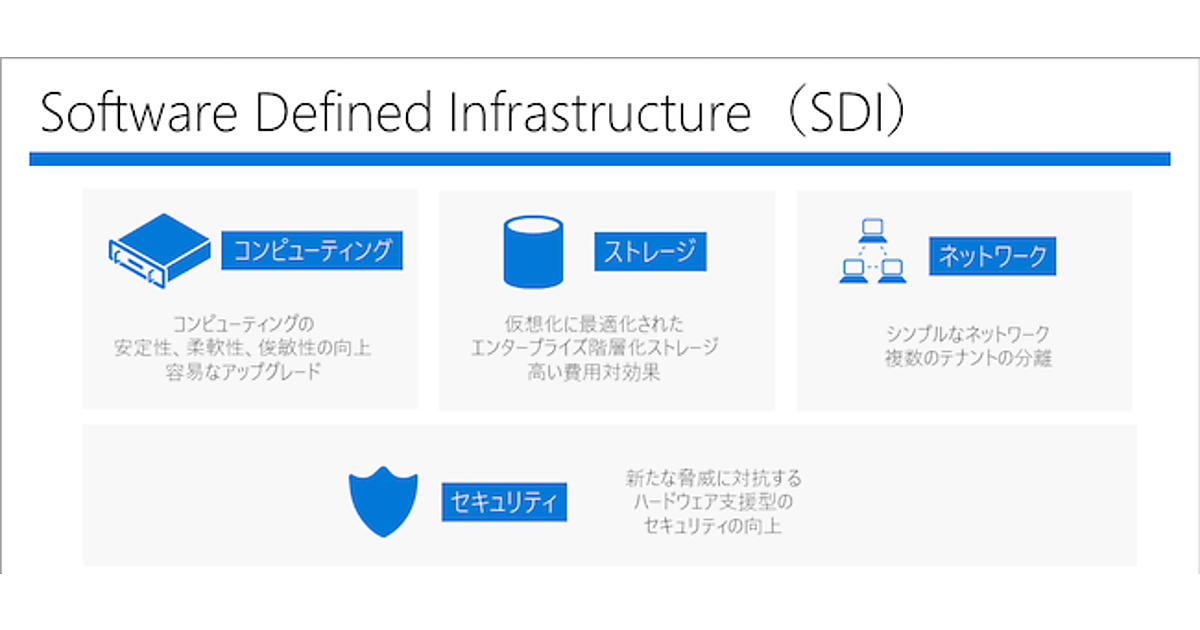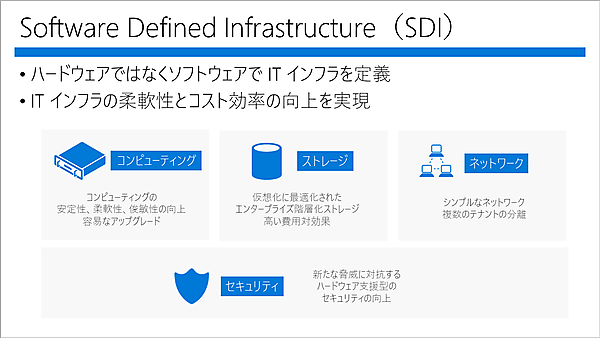 吉田氏はWindows Server 2016をSDI(Software Defined Infrastructure)に対応したサーバーOSであると位置づけた。氏はSDIを「ハードウェアではなくソフトウェアでITインフラを定義するもので、コストと柔軟性をもたらす」と説明する。吉田氏の講演は、このSDIの「コンピューティング」「ストレージ」「ネットワーク」「セキュリティ」の4分野で構成された。