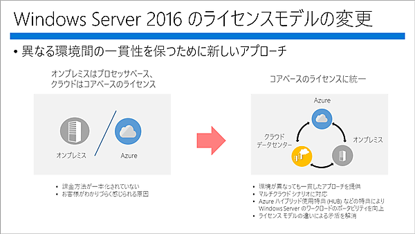 それに先立ち、Windows Server 2016の変更点として、ライセンスモデルの変更が語られた。オンプレミスとクラウドのライセンスモデルが一本化され、コアベースのライセンスに統一されたという。