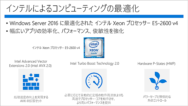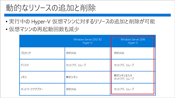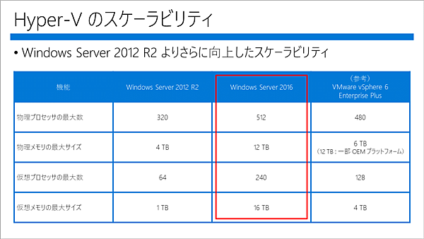 1つめの分野はコンピューティングだ。まず、Hyper-Vのスケーラビリティ向上が紹介された。物理プロセッサの最大数が512、物理メモリの最大サイズが24TBとなり、仮想プロセッサや仮想メモリのスケーラビリティも向上している。吉田氏は「VMwareに負けない数値」と語った。