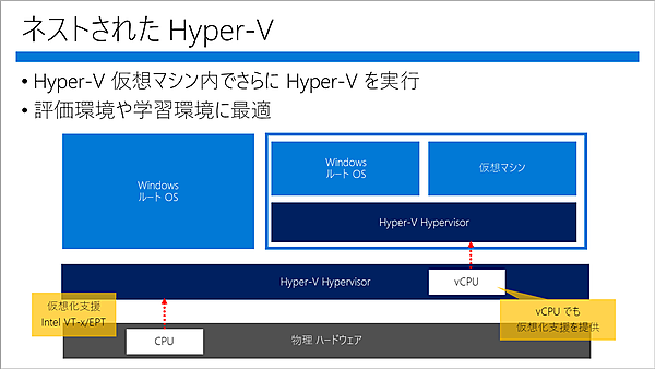 続く新機能として、ネストされたHyper-V、つまりHyper-Vの仮想マシンの中でHyper-Vを動かす機能が紹介された。仮想マシンのvCPUで仮想化支援機能をサポートしたことにより実現された。ただし、Windows Server 2016のHyper-Vどうししかネストできないという。吉田氏は実際にHyper-Vの仮想マシンでHyper-Vを動かすところをデモした。