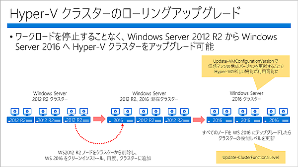 そして新機能として、まずHyper-Vクラスターのローリングアップデートが紹介された。Hyper-VクラスターをWindows Server 2012 R2からWindows Server 2016にアップグレードする際に、ワークロードの停止をなくすというものだ。これはアップデートするホスト上の仮想マシンを一時的にほかのホストにマイグレーションすることで実現するという。「ポイントはWindows Server 2012 R2のクラスターにWindows Server 2016が混在できること」と吉田氏は説明した。