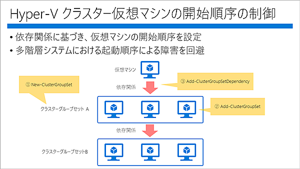 続いて、Hyper-Vクラスターの仮想マシンの開始順序の制御も紹介された。仮想マシンの依存関係にもとづいて、依存される仮想マシンを先に起動するというもので、「これまでは運用で回避していたものが、PowerShellで依存関係を設定できるようになった」と説明された。