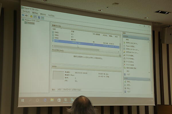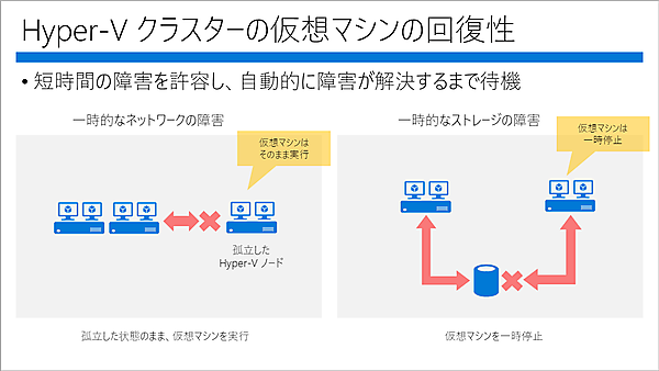 次に、Hyper-Vクラスターの仮想マシンの回復性だ。「ネットワークの接続が一時的に切れたのでフェイルオーバーしたら、勝手に直って、フェイルオーバーが無駄になった」というケースを想定した機能で、短時間の障害を許容し、しばらくフェイルオーバーせずに待つのだという。これも吉田氏が、仮想マシンを一時停止するところをデモした。