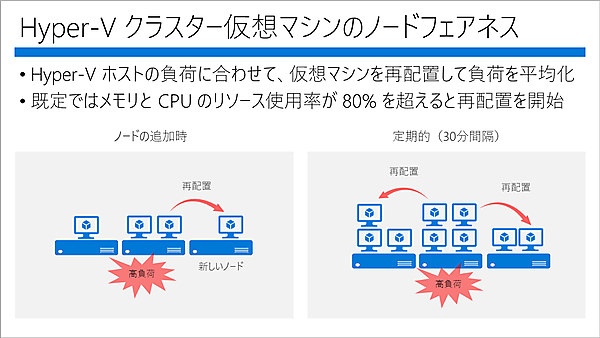 Hyper-Vクラスターの新機能の最後は、ノードフェアネスだ。ホストの負荷に合わせて仮想マシンを再配置して平均化するもので、これまではSCVMM(System Center Virtual Machine Manager)が機能を持っていたが、Hyper-Vだけでできるようになったという。