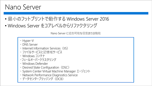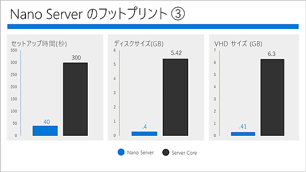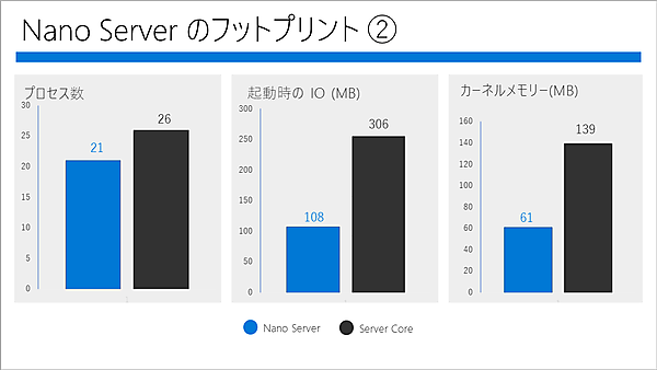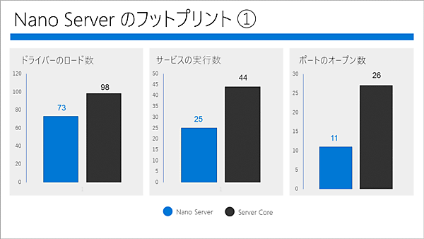 次にNano Serverが紹介された。最小のフットプリントで動作するWindows Server 2016で、吉田氏は従来のServer Coreと、ドライバーのロード数やサービスの実行数、起動時のI/O、カーネルメモリー、ディスクサイズなどの数値で比較した。