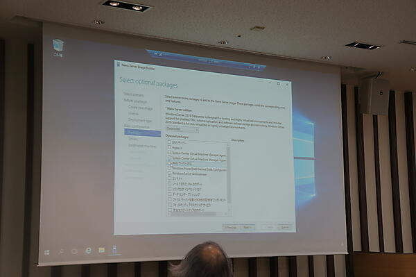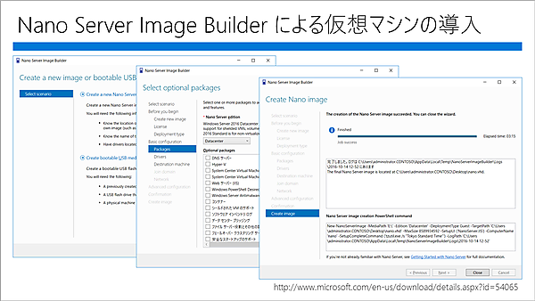 さらに、Nano Serverのイメージを作成するNano Server Image Builderを紹介し、デモがなされた。Nano Serverのイメージに入れたいパッケージを選んでVHDイメージやUSBメモリーを作成するもので、作ったNano Serverイメージが約5秒で起動するところを見せた。