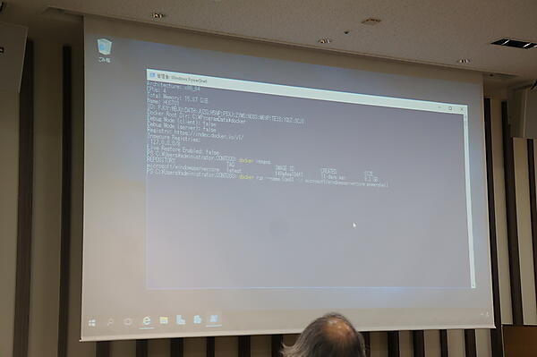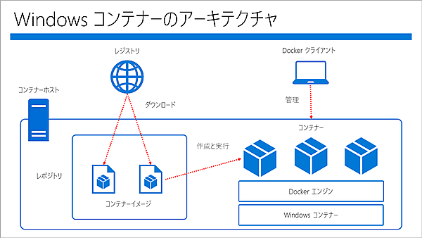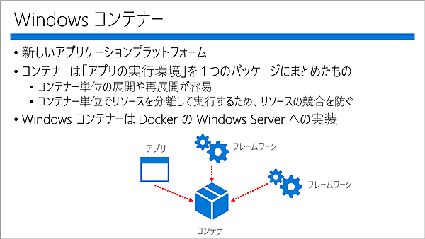 その次はWindowsコンテナーだ。コンテナー型仮想化によりアプリケーションだけを動かすもので、DockerをWindowsに実装したものだという。コンテナーイメージもDocker Hubから取得できる。