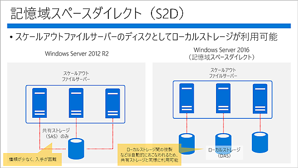 2つめの分野はストレージだ。まず、記憶域スペースダイレクト(S2D)が紹介された。スケールアウトファイルサーバーのストレージとして、それぞれのローカルストレージを束ねてSASの共有ストレージのように使える機能だ。吉田氏はこれをハイパーコンバージドのシナリオとして語った。