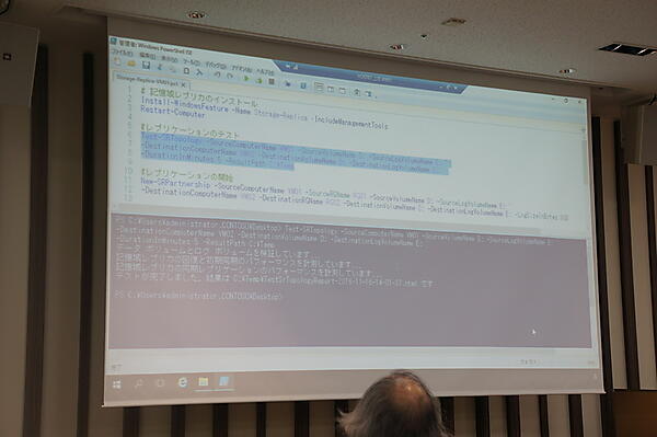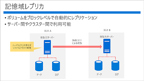 続いて記憶域レプリカが紹介された。ボリュームをブロックレベルで自動的にレプリケーションするもので、Power Shellで設定する。吉田氏は、記憶域レプリカを設定してレプリケーションするところや、設定を変更して逆向きにレプリケーションするところをデモした。