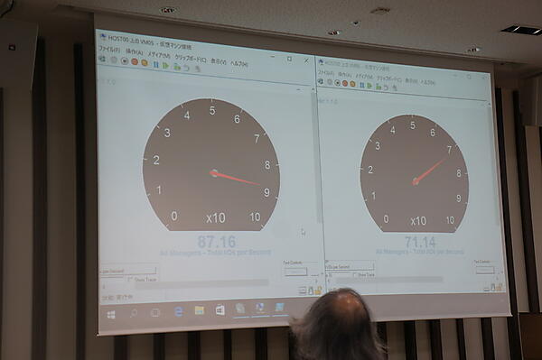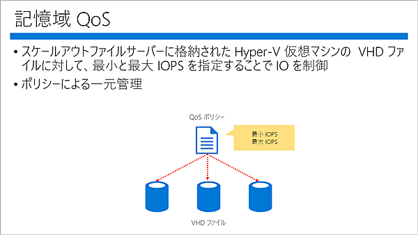 記憶域QoSもデモされた。仮想マシンに対して最小と最大のIOPSを指定する機能で、従来はVHDの1つ1つに設定する必要があったのが、Windows Server 2016ではポリシーで一元作成できるようになった。デモでは、2つの仮想マシンで合計150 IOPSになるように設定して実際にIOPSを計測してみせた。