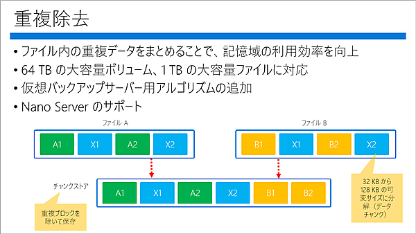 重複除去についても新機能が紹介された。Windows Server 2016では、64TBの大容量ボリュームや1TBの大容量ファイルに対応した。