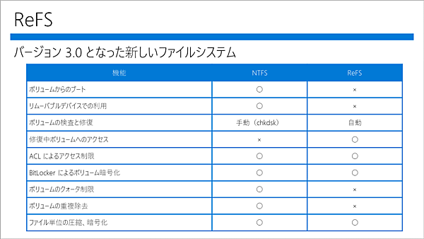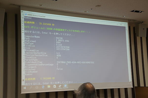 Windows Server 2012で登場した新ファイルシステムReFSは、Windows Server 2016でバージョン3.0になり、「実用段階になった」と吉田氏は語った。デモでは、容量固定のVHDファイルを作るところをNTFSとReFSで比較し、NTFSで28秒のところ、ReFSで10倍容量のVHDを作って1.14秒で終わる様子を見せた。