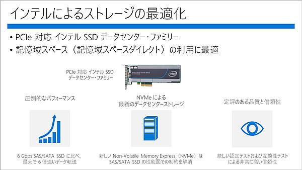 ストレージの最後に、インテルによるストレージの最適化として、PCIe対応(NVMe)インテルSSDデータセンター・ファミリーを紹介した。まず、NVMe SSDとSAS SSD、SATA HDDを比較して圧倒的に性能が向上するという結果を見せた。そのうえで、3つのシナリオとして、HDDにNVMe SSDをキャッシュとして組み合わせたシナリオ、SATA SSDにNVMe SSDをキャッシュとして組み合わせたシナリオ、すべてNVMeのシナリオを説明した。