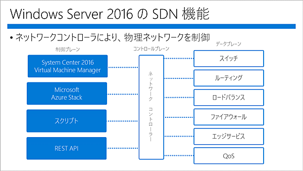 3つめの分野はネットワークだ。Windows Server 2016にはSDNの機能として、仮想スイッチなどのデータプレーンの機能と、それを制御するコントロールプレーンのネットワークコントローラーの機能をOSの機能として用意しているという。