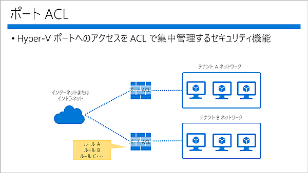 また、ポートACLもデモされた。ネットワーク全体にACLをわりあててHyper-Vポートへのアクセスを集中管理するものだ。
