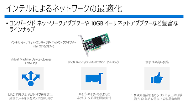 ネットワークの最後に、インテルによるネットワークの最適化も説明した。VMDqやSR-IOVに対応したネットワークアダプターIntel X710/XL740が紹介された。
