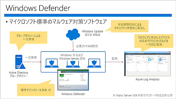 4つめの分野はセキュリティだ。まずは「Windows Defender」が紹介された。これまでクライアントOSに搭載されていたものだが、Windows Server 2016にもNano Server以外には標準でインストールされるようになった。グループポリシーによる一元管理や、WSUSによる定義ファイルの配布に対応するほか、監視情報もAzure Log Analyticsのサービス連携で一元管理できるという。