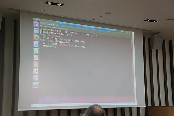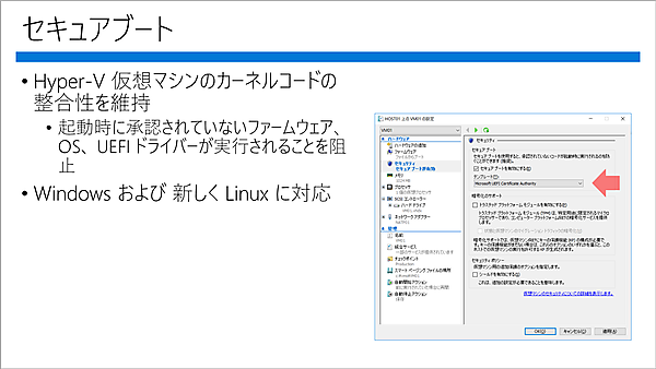 続いてHyper-Vにおける新機能として、Linuxゲストのセキュアブートに対応したことが紹介され、デモとして実際にゲストとしてUbuntuをセキュアブートしてみせた。