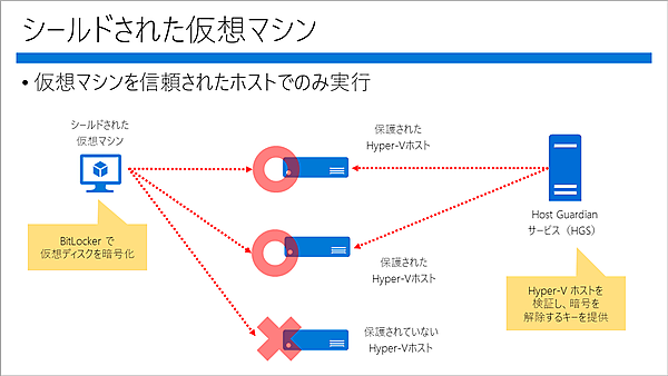 次に、シールドされた仮想マシンだ。Hyper-Vの仮想マシンイメージを暗号化するもので、BitLockerの技術が使われている。暗号の鍵は専用の「HGSサーバー」で管理し、信頼されたHyper-Vホストだけに限定して鍵を渡すという。「信頼するホストを設定する方法として、いちばん簡単なのはADでグループを作ることだ」と吉田氏は説明し、信頼していないホストで起動が禁止されるところをデモした。