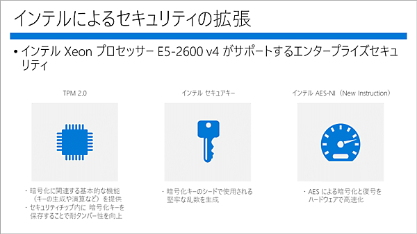 セキュリティの最後に、インテルによるセキュリティの拡張も説明された。Xeon E5-2600 v4がサポートがサートするTPM 2.0とインテルセキュアキー、AES-NIが紹介された。
