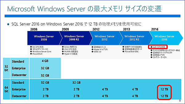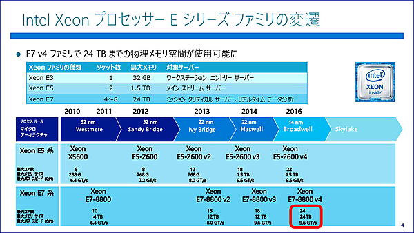 それに関連して、インテルXeon E7-8800 v4ではメモリ最大24TBまでとなっていることや、Windows Server 2016の最大メモリサイズが24TBになったことを紹介した。