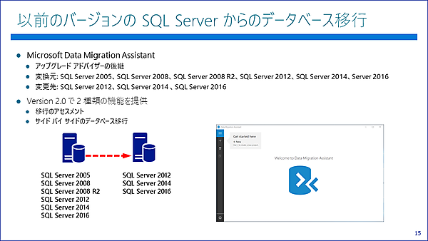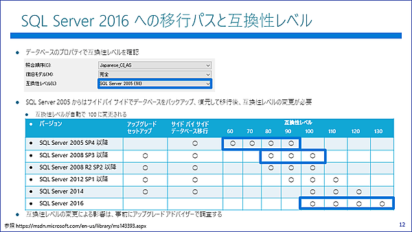 続いて、SQL Server 2016への移行パスが解説された。移行できるのはWindows Server 2005 SP4以降だ。ただし、OSのバージョンごとに互換性レベルが定められており、SQL Server 2016が100以上のところ、Windows Server 2005 SP4は60〜90で強制的に100に変更されるため、検証が必要だという。これについては、検証ツールがUpgrade AdvisorからMicrosoft Data Migration Assistantに変わったことも注意点として挙げられた。