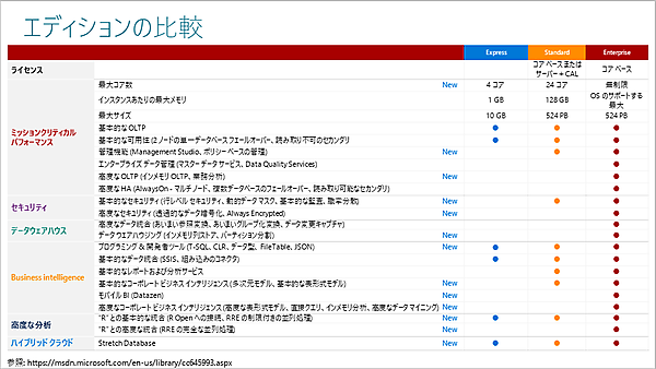 SQL Server 2016のプリンシパルエディションはEnterpriseとStandardがある。また、Expressと同じように、開発とテストにのみ利用可能なDeveloperが無償となった。11月にリリースされたSQL Server 2016 SP1では、ExpressとStandardの機能が増えたことも説明された。沖氏によると、アプリケーションをStandardからEnterpriseに透過的に移行できるようにするためだという。