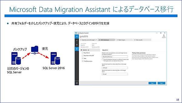 また、Microsoft Data Migration Assistantでは、共有フォロダーを介してデータベースのバックアップと復元ができるというところもデモされた。なお、他社製品のデータベースの移行については、SQL Server Migration Asistant(SSMA)が紹介された。