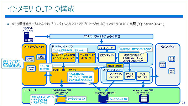 沖氏は、従来のRDBMSエンジンとインメモリOLTPのアーキテクチャの図を示した。従来のRDBMSエンジンではロックやラッチによる排他制御が入るが、インメモリではそれがなく、ページではなくレコードや行がそのまま扱われると説明がなされた。