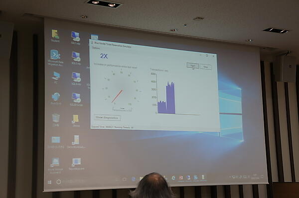 ここで従来のRDBMSエンジンとインメモリOLTPのパフォーマンスをデモし、2倍のパフォーマンスとなるところを見せた。