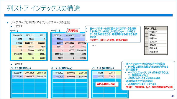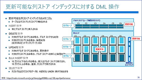 氏は非クラスター化列ストアインデックスが更新可能になった手法として、行の挿入や削除がデルタストアに対してなされ、定期的にデルタストアからインデックスが更新される(タプルムーブ)ことが解説された。