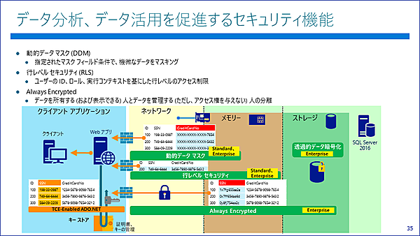 3つめはセキュリティだ。SQL Server 2016のセキュリティ機能として、動的データマスク(DDM)と、行レベルセキュリティ(RLS)、Always Encryptedが紹介された。