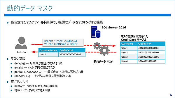 動的データマスク(DDM)は、クレジットカードなどの重要な情報を、表示のときに「XXXX」のようにマスキングする機能だ。マスク関数により、たとえばカード番号はすべてマスクし、メールアドレスは一部マスクし、パスワードは1文字目以外をマスクする、といったことができることが、デモをまじえて説明された。