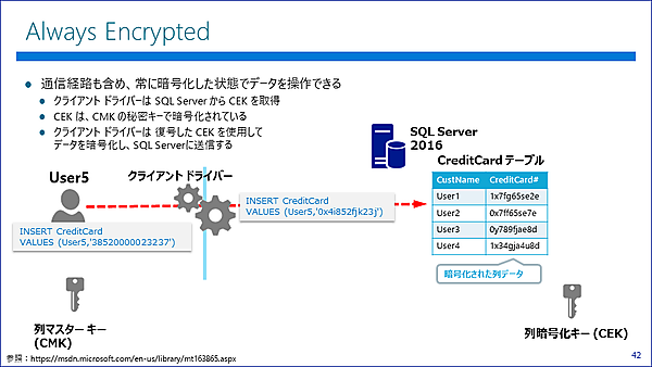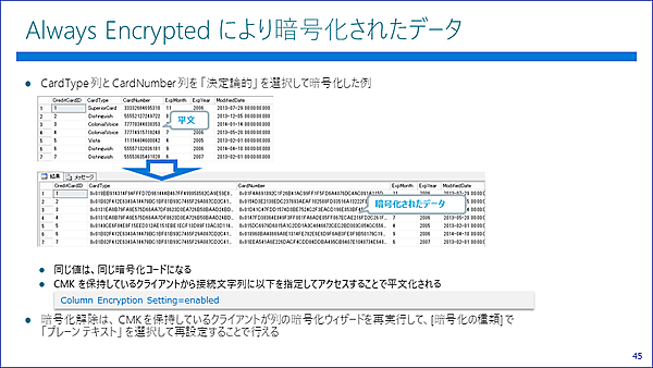 Always Encryptedは、通信経路も含め、常に暗号化した状態でデータを操作するものだ。鍵(列マスターキー)はユーザーが持ち、持っていないユーザーはデータを見られないという。これについてデモがなされ、同じデータは暗号化したときに同じ内容になってしまう「決定論的」と、違う内容になるがそれによりインデックスが効かなくなる「ランダム化」の2種類の暗号化方法のトレードオフについても説明された。