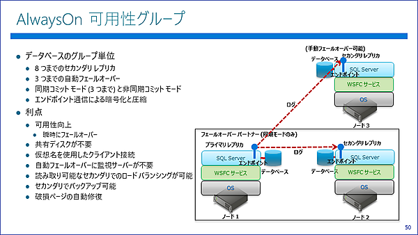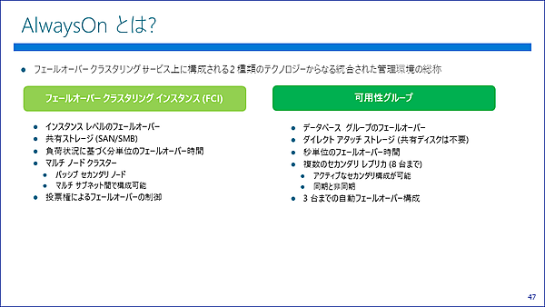 4つめは可用性向上について、「AlwaysOn」という言葉で紹介された。AlwaysOnはフェールオーバークラスタリングインスタンス(FCI)と可用性グループからなる統合された管理環境の総称だという。フェールオーバークラスターについては吉田氏によるWindows Server 2016の解説で扱われたことから、沖氏は可用性グループについて解説した。