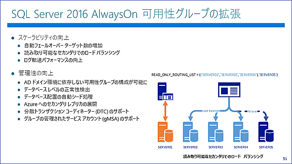 沖氏はSQL Server 2016での可用性グループの拡張として、自動フェールオーバーターゲット数が2から3になったことや、読み取り可能なセカンダリでのロードバランシング、ADドメイン環境に依存しない可用性グループ、データベースレベルの正常性検出、自動シード処理を挙げた。