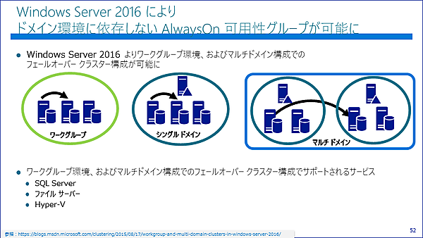 この中でもADドメイン環境に依存しない可用性グループについてデモがなされた。ワークグループ環境やマルチドメイン構成でのフェールオーバークラスター構成が可能になったというものだ。