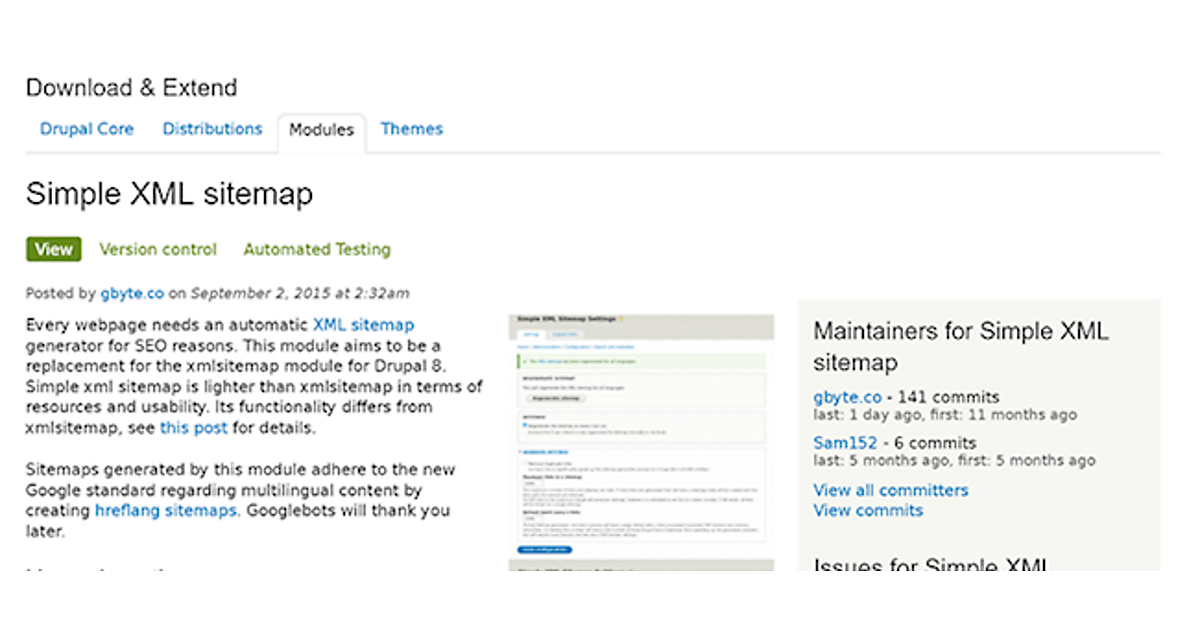 3.「Simple XML sitemap」モジュールのページが表示されます。このように、モジュールやテーマはそれぞれ、個別のページを持っています。モジュールを探す上でこのページの情報はとても重要となります。後ほど、このページの情報の見方を詳しく説明します。