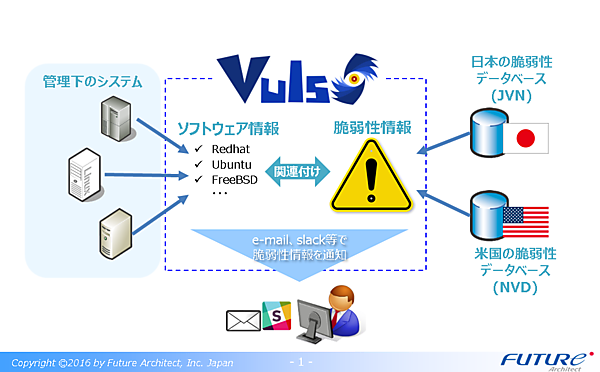 神戸氏:VulsはVULnerability Scannerの略で、Linux/FreeBSD向けの脆弱性スキャンツールです。OSのみならずプログラミング言語やライブラリに至るまで多くの環境に対応し、レポートや通知を行います。ソフトウェアには数多くのバグが含まれ日々脆弱性に関するレポートが報告されています。サーバー管理者は脆弱性に関する情報を随時チェックし、その脆弱性が自身が管理するサーバーにどれくらい含まれているのか影響範囲を調査し、深刻度や緊急性に応じて対応しなければなりません。管理対象のサーバーが多くなるにつれものすごい作業負荷になります。この分野はこれまで自動化が遅れていましたが、Vulsを活用することで可視化し漏れがなくなります。