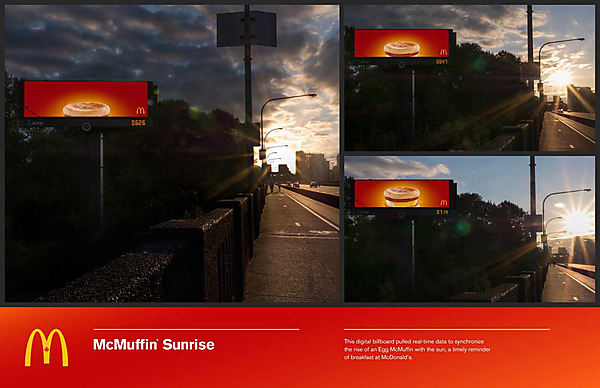 カナダのマクドナルドでは、屋外のデジタルサイネージ上で“朝日”とリアルタイムで連動したプロモーションを行っています。