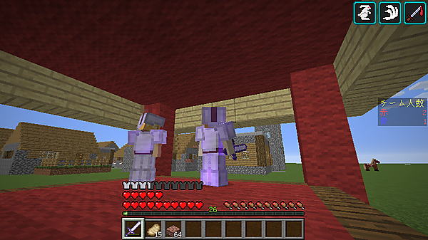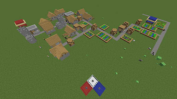まずはPvPを遊ぶためのフィールドを用意してみましょう。今回は「青と赤で別れて戦う」ことを想定します。クリエイティブモードやWorldEditのModを導入したクライアント、プラグインとして導入したサーバーで適当に思うままに作ってみてください。ここでは、スーパーフラットに生成された村を借りてPvPをやってみます(図2)。